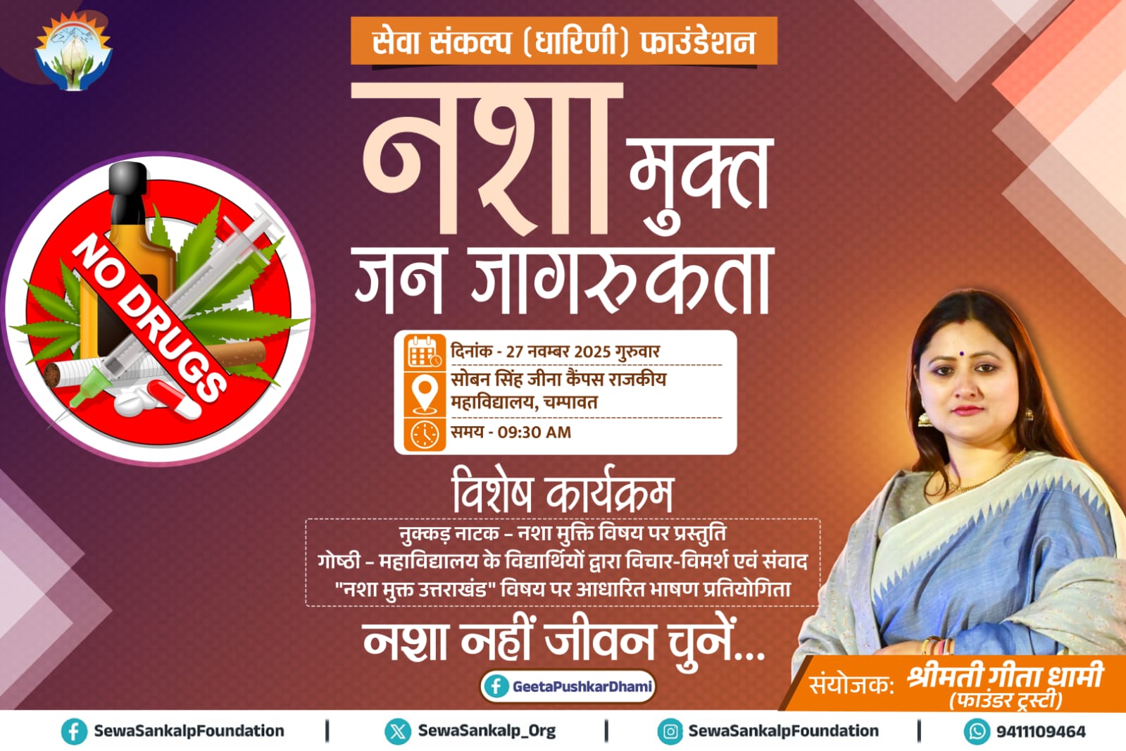 चम्पावत 20 नवम्बर 2025 *24 से 27 नवम्बर : सेवा संकल्प धारिणी फाउंडेशन का जनस्वास्थ्य एवं नशा-मुक्ति मिशन* सेवा संकल्प…